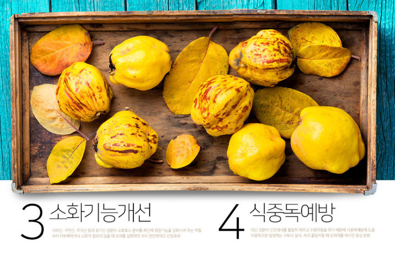 - 모과에 함유된 유기산과 펙틴은 장운동을 촉진하고 소화를 도와줍니다.